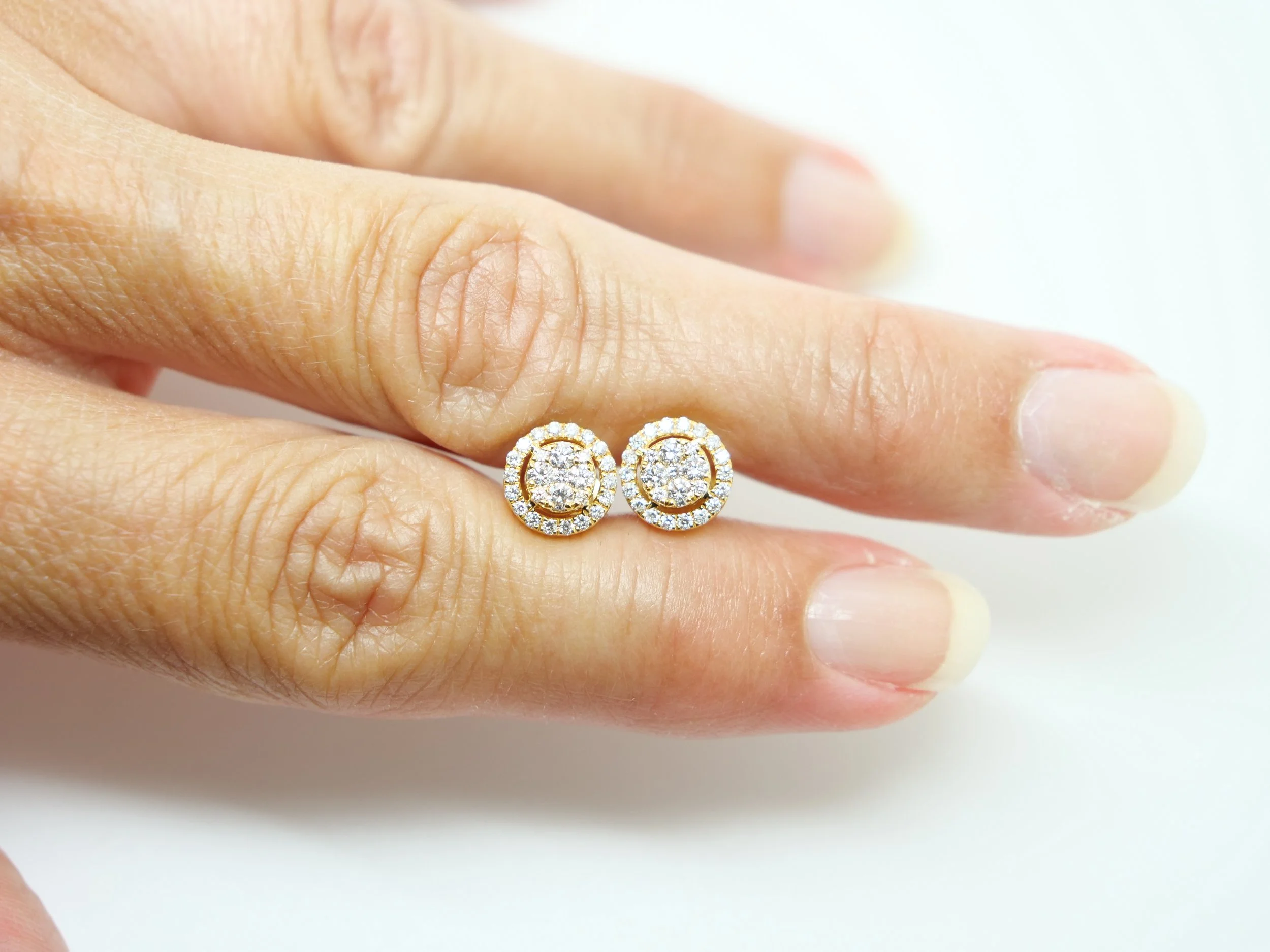 Lovely 18ct gold emerald and diamond stud earrings, each set with a round cut emerald and surrounded by diamonds. With butterfly backs.