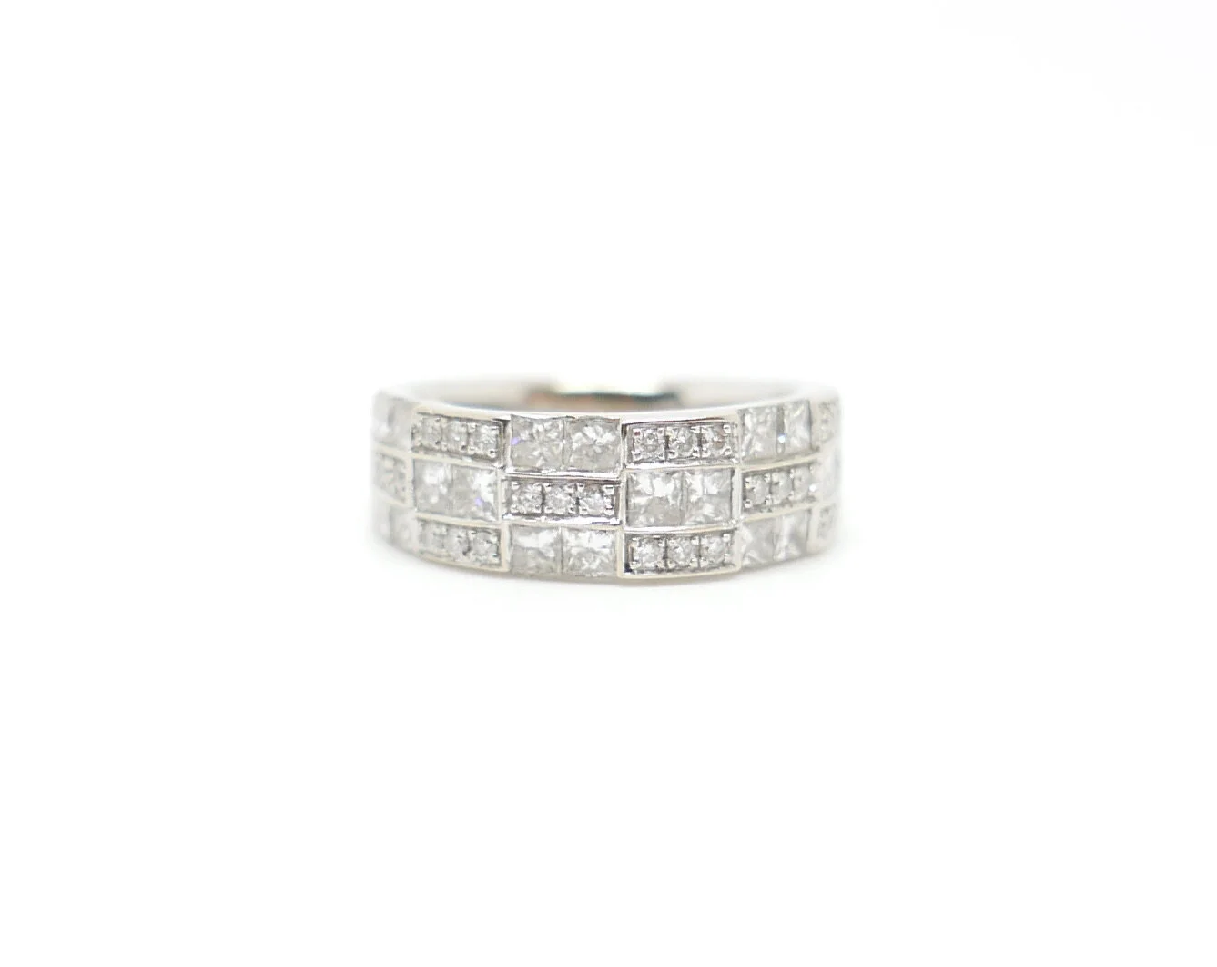 Lovely heavy diamond ring, set with a mixture of brilliant cut diamonds. In all, the ring boasts 1.44 carats in diamond weight. All set in 18ct white gold.