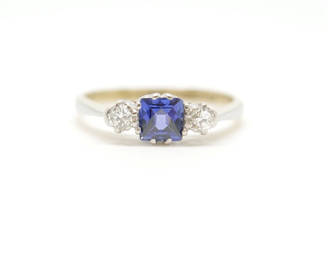 Image 1 of 5 Image 2 of 5 Image 3 of 5 Image 4 of 5 Image 5 of 5 Sapphire & Diamond Ring in 18ct Gold and Platinum £569.00 Sold Very pretty square sapphire, with a diamond to each side. Setting in platinum, with an 18ct gold band.Ring Size: M Sold Added! Very pretty square sapphire, with a diamond to each side. Setting in platinum, with an 18ct gold band.Ring Size: M