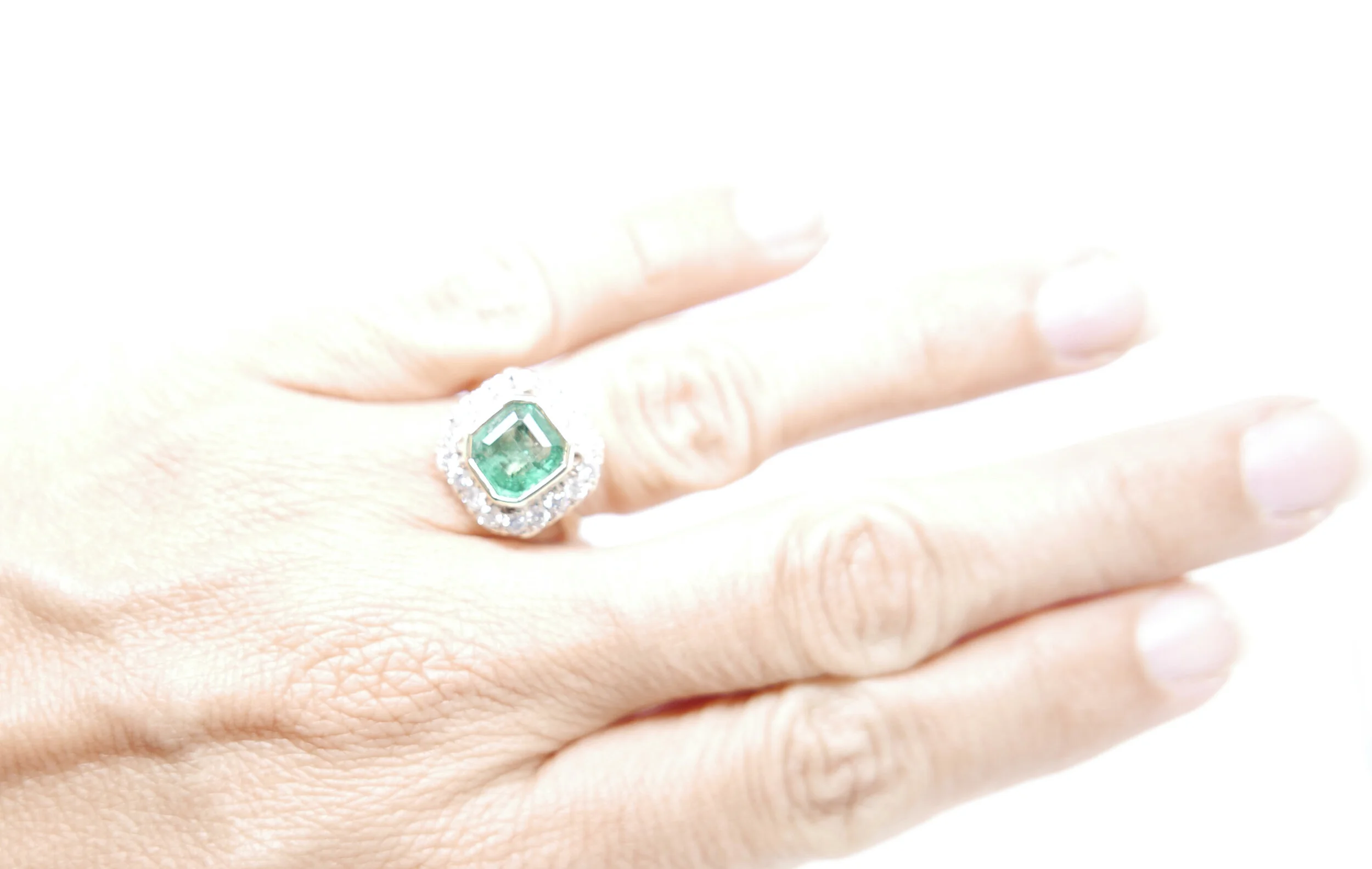 Stunning natural emerald stone, in an octagonal shape with a beautiful vivid green colour. Small brilliant cut diamonds surround the central emerald, with a superb sparkle. Crafted in 18ct gold.
