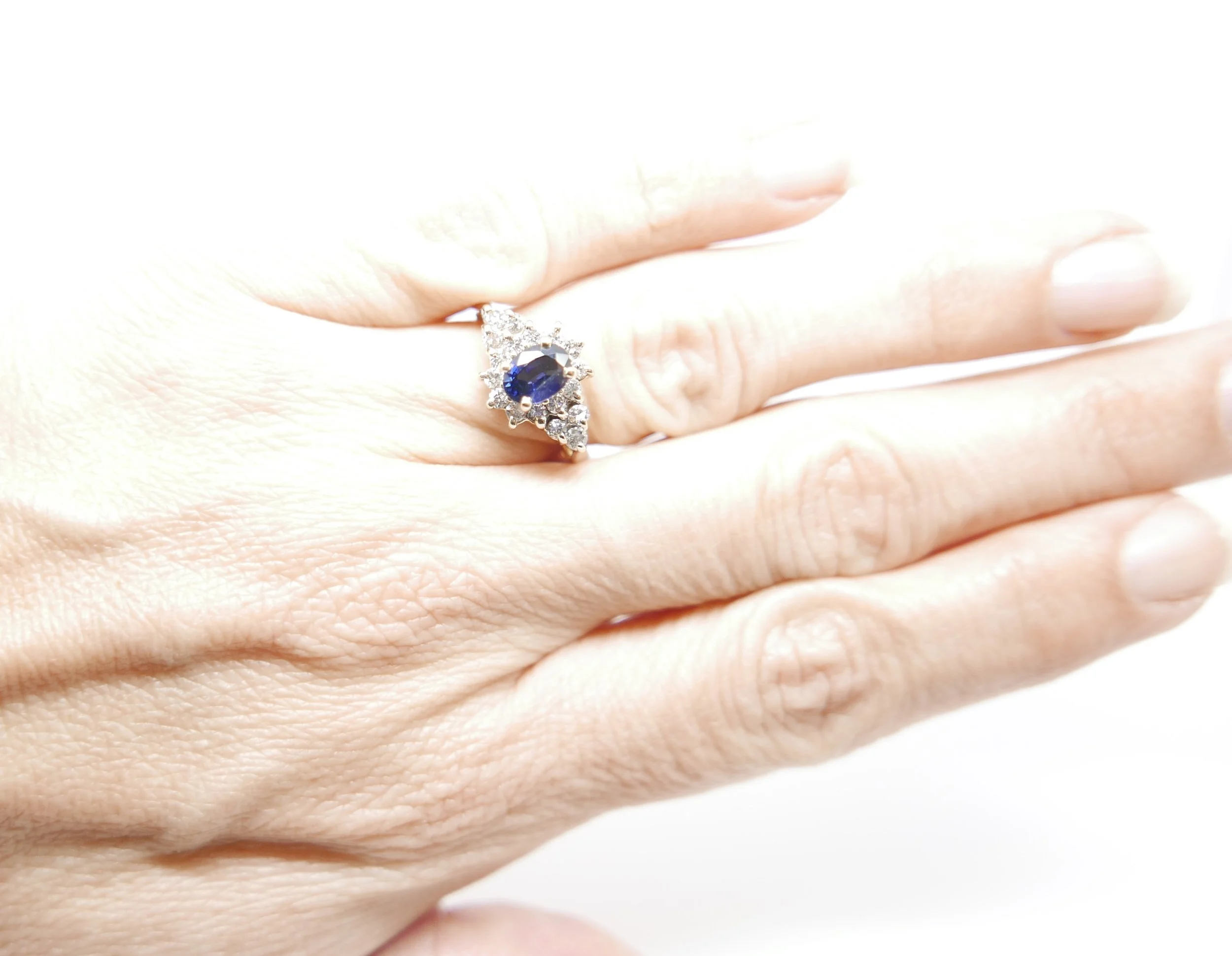 Stunning blue central oval cut 1 carat sapphire, surrounded by eighteen diamonds. Approximate diamond weight of just under half a carat. All set in 14ct gold.